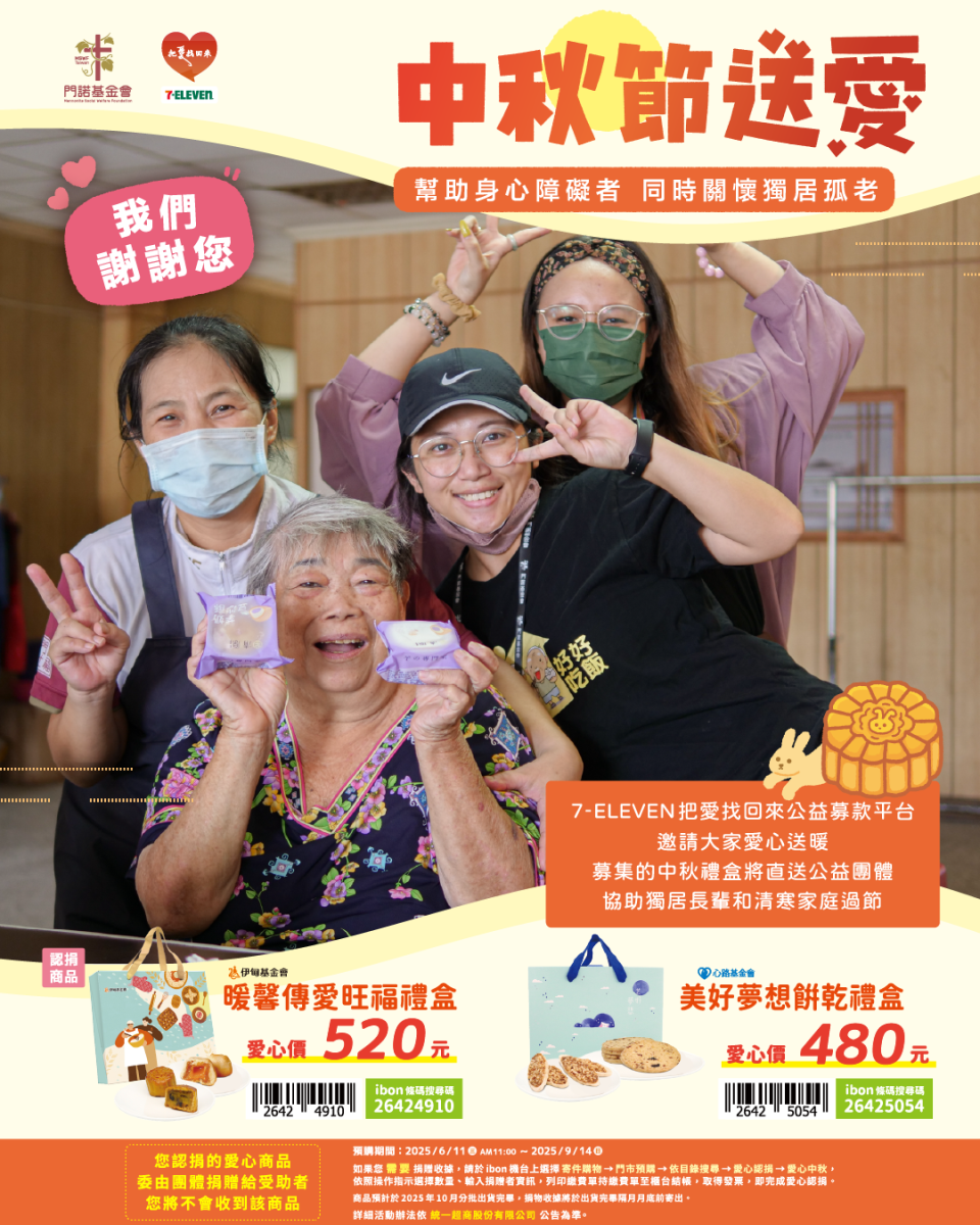 感謝 7-ELEVEN「把愛找回來」公益募款平台 攜手門諾基金會,共同募集暖心月餅禮盒,讓溫暖走進每個需要關懷的角落。