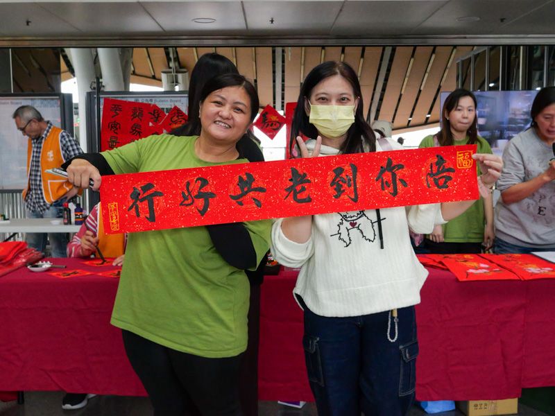 不少返鄉旅客與親子家庭駐足排隊等候,墨香與笑聲交織,現場洋溢濃濃年味與溫馨氛圍。除索取春聯外,門諾基金會也同步設置服務宣導攤位,向民眾介紹基金會在花東偏鄉推動的長照服務與長照3.0資訊,讓公益參與不只停留在捐款,更深化對長照議題的理解。