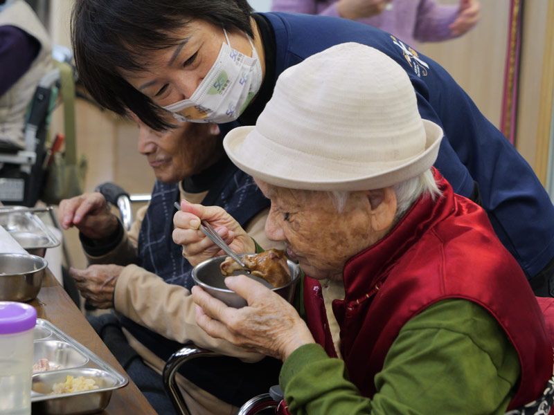 在花蓮美崙日照中心,用餐前燈光漸暗,熟悉的〈星期五晚上〉音樂響起,長者們坐在椅子上揮動雙手、踏著腳步,臉上滿是笑容。工作人員笑說,希望阿公阿嬤「先動一動、再好好吃」,讓每一道年菜都吃得開心又安心。