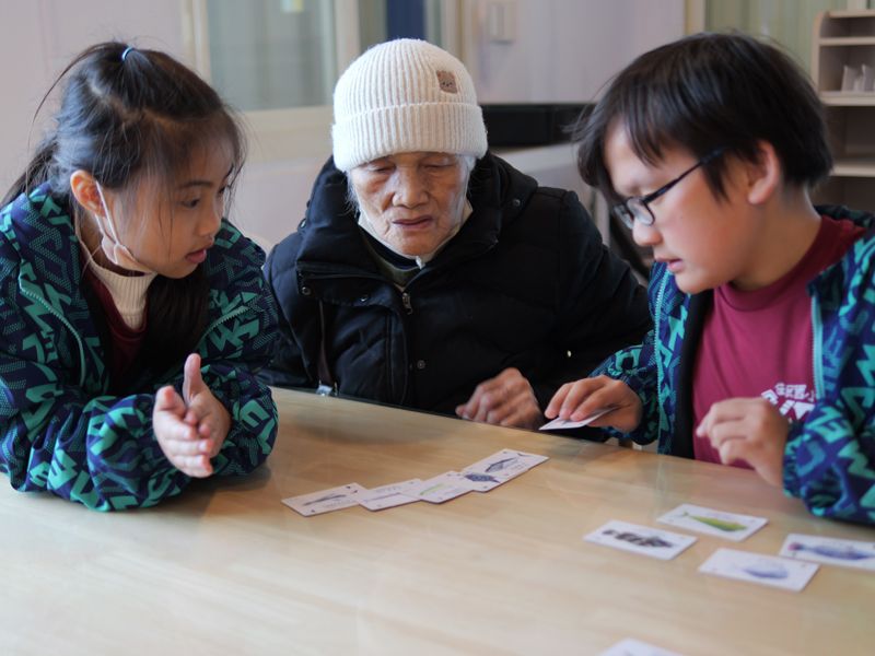活動現場,84歲的林阿嬤看著六年級周王同學熟練地分類魚類卡牌,欣慰笑說:「以前手作課時,他還需要我幫忙剪圓形,現在真的長大了!」原來,周王同學從二年級起就與林阿嬤一起上課。四年過去,當年的稚氣男孩已長成小少年。如今身份翻轉,他在一旁認真的向阿嬤介紹魚的特徵,這種跨越時光的陪伴,正是老幼共學最無可取代的價值。