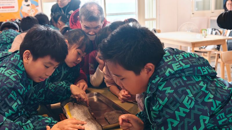 另一個溫馨畫面出現在觀察鬼頭刀時。失智長者對於陌生事物往往帶有防備,林阿嬤起初不敢觸摸魚體,一年級的周同學不斷鼓勵「阿嬤試試看!」,阿嬤終於伸手摸了摸魚身,緊張表情瞬間轉為笑容。