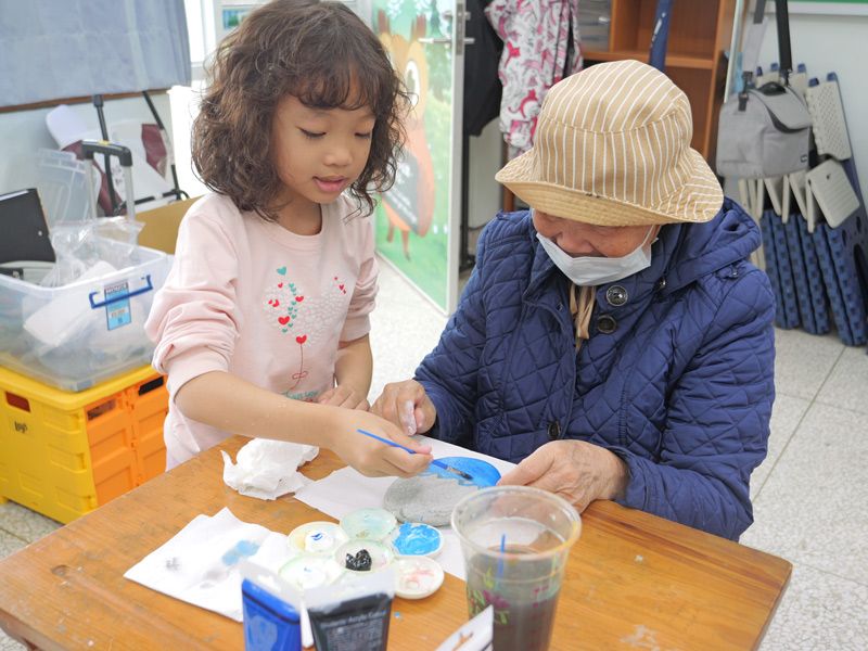 在當日的美術課程中,一年級的孩子自然地成為長輩的「小眼睛」。在進行石頭彩繪時,郭阿嬤因石頭與鉛筆顏色太過相似而面露難色、停下畫筆,鄰座的邱同學見狀,立刻主動接手幫阿嬤在石頭上勾勒出清晰輪廓。