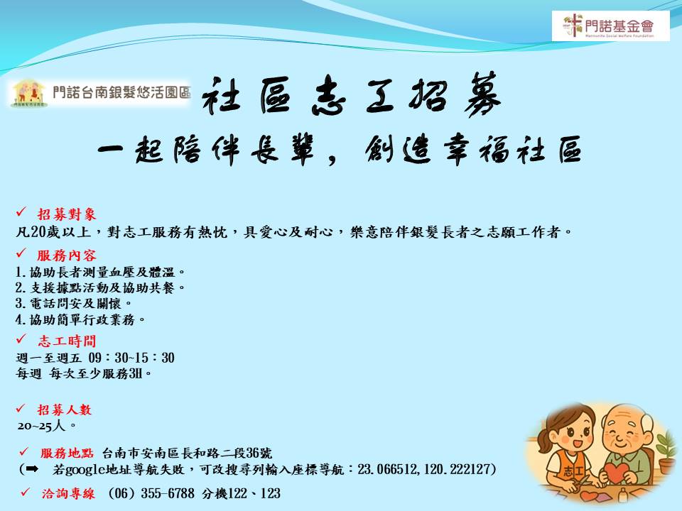 歡迎~凡20歲以上,男女不拘,對志工服務有興趣,具愛心、耐心、熱心及服務熱忱,樂意以熱心與熱忱來服務銀髮族之需求之志願工作者。