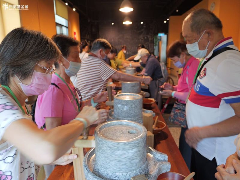 抵達觀光工廠後,長輩們參觀穀物加工線、了解月餅製程,並親手體驗磨穀樂DIY。原本在一旁靜靜觀察的李伯伯,想起自已年輕時也是靠磨穀機製粿維生,覺得小磨石不如當年的工具。後來在同仁熱情邀請下,才終於動手體驗,也喚起當年打拼記憶,露出久違的笑容。